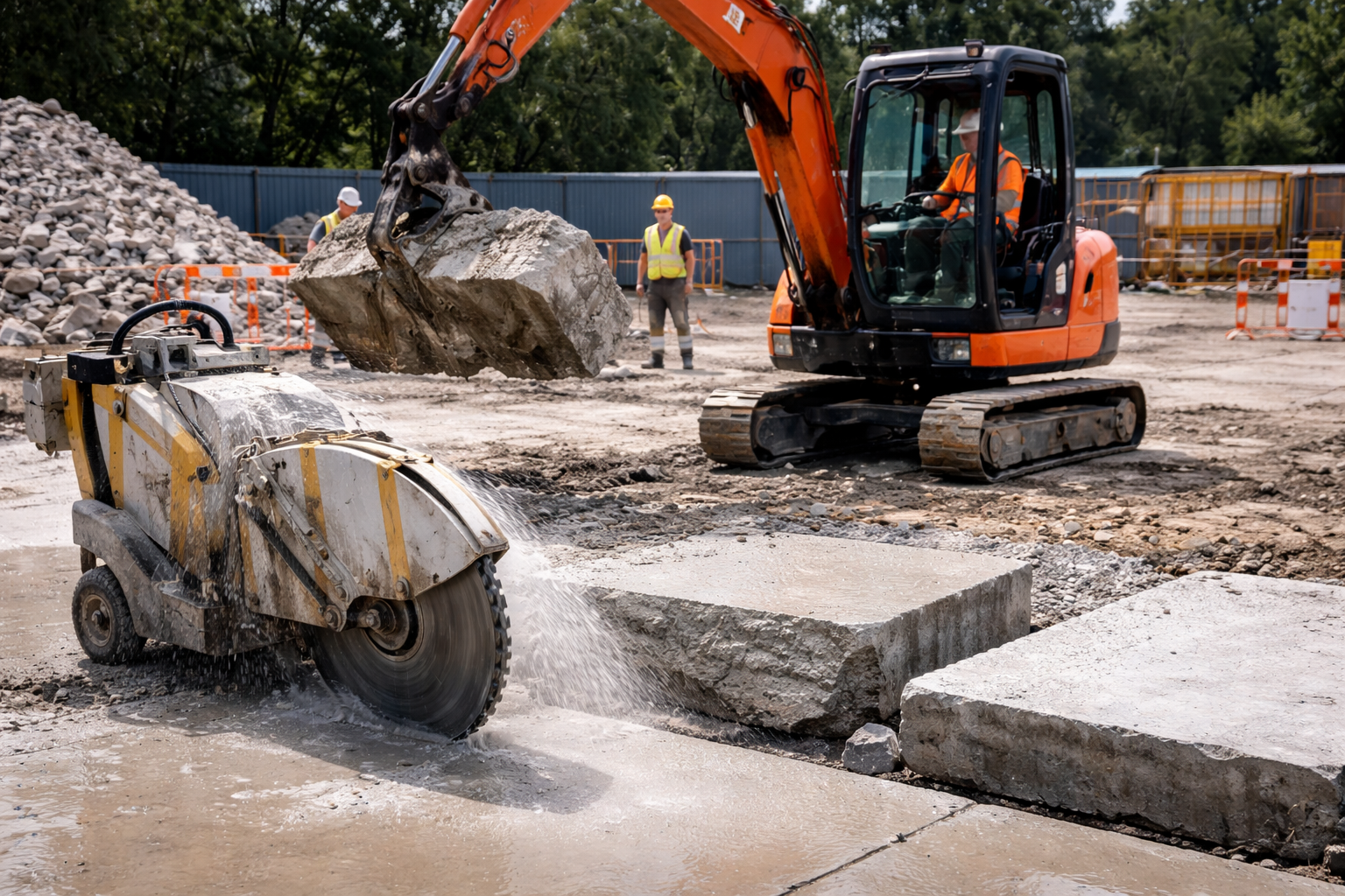 This stage requires skill and coordination. Operators need to move efficiently without damaging nearby surfaces or slowing other trades. A well-cut slab makes this much easier. Machines can lift cleaner sections, load faster, and keep the project moving without unnecessary rework.